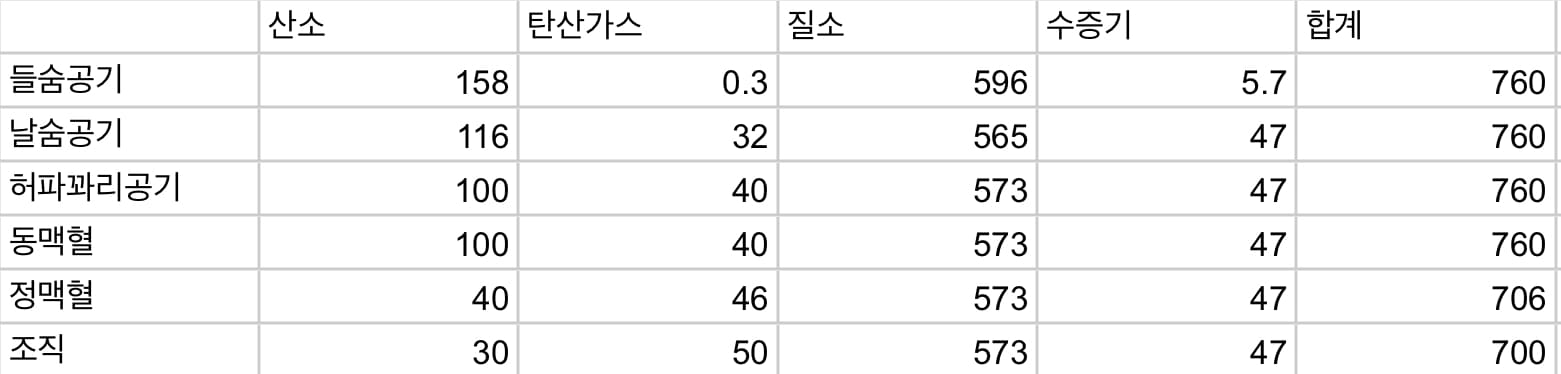 전신의 조직이 1분간에 소비하는 산소 양은 250ml/분이고, 생산되는 이산화탄소 양은 200ml/분이다.